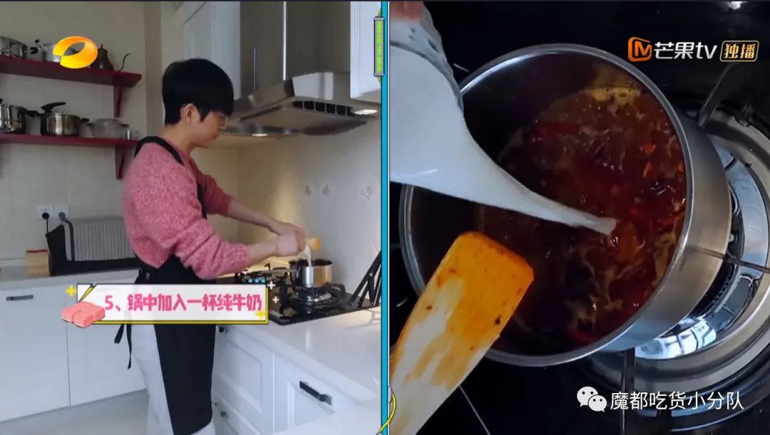 2⃣️翻炒底料:加火锅底料和豆瓣酱翻炒开,加1大碗水煮1分钟,再加200ml牛奶
