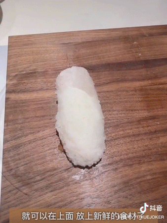 2⃣️寿司醋100g、糖50g、盐10g与饭拌匀,把饭捏成寿司状