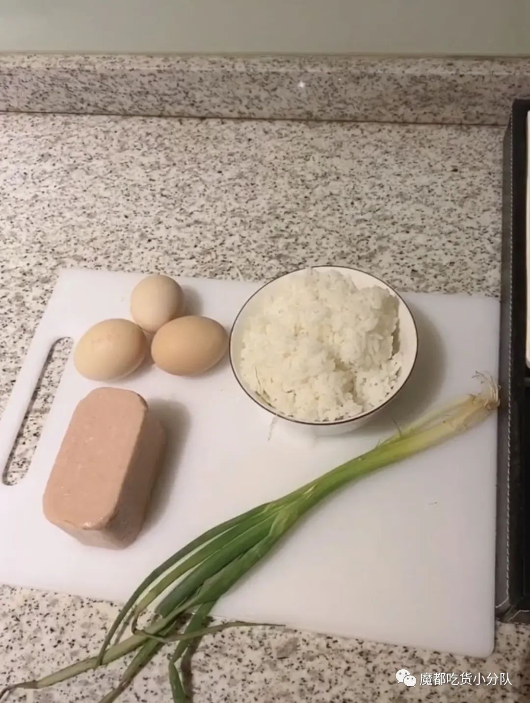 必备材料:鸡蛋3个、隔夜饭1碗、午餐肉1块、葱、葡萄干