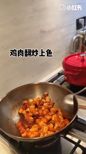 4⃣️鸡肉上色:起锅烧肉,倒入白糖,等糖融化把鸡肉放入锅里翻炒上色