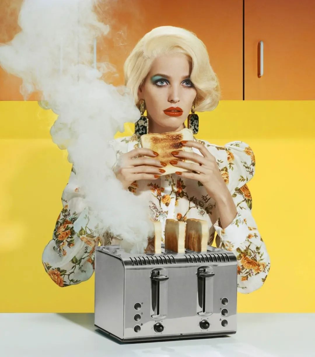奥尔德里奇的时尚摄影充满了模糊的符号学指涉,像是一部悬疑电影,甚至是邪典。他惯于抓拍正在进行中的动作。在浮夸的家庭式情景里,妆发入时的女孩正用煤气灶点燃香烟,她的头发披散开来,似乎也将要被引燃,美艳的诱惑性与隐隐不安并行。截然而止的动作,让我们能从中窥见一个开放式的情境。但不同于一部电影中截取的一幕,模糊的指涉使他的图像自成一体,传达了一种无法言明、不知因果的叙事。