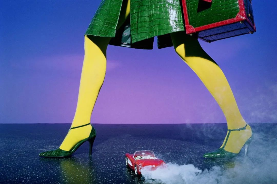 在2000年为意大利版《Vogue》拍摄的作品中,也展现了这种女性对世界的审视。高跟鞋在这里作为女性的象征,始终占据视线的焦点。模特双腿的特写引入了这种气势,于是象征极致奢华的豪车成为了手中玩具,被设置得格外微小。这或许是奥尔德里奇想要传递的信息——对现代生活、消费文化的评论与批判。