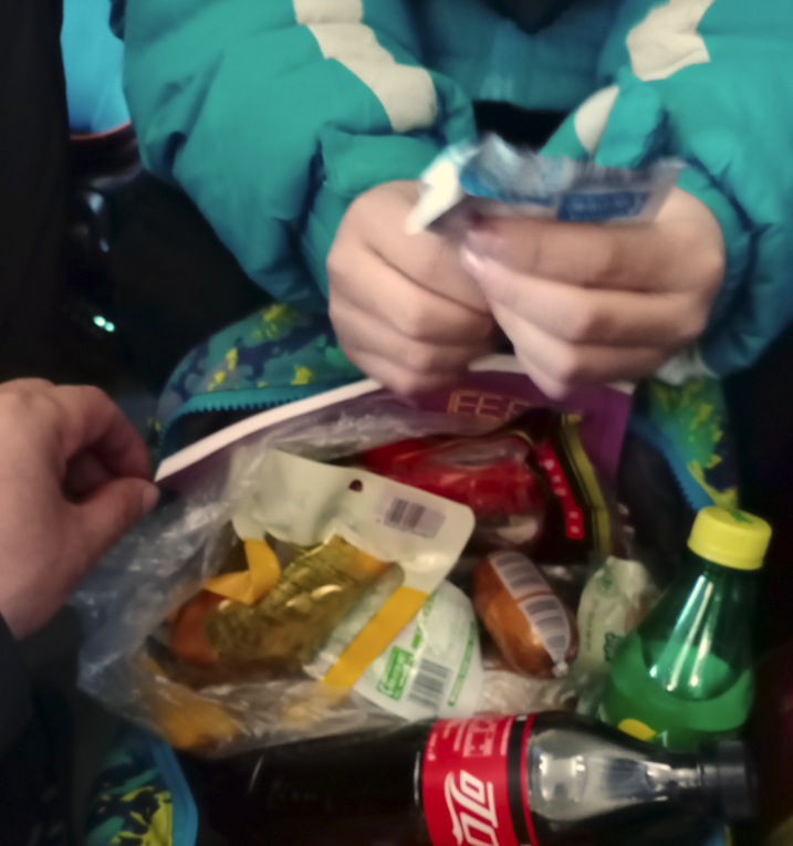 木工夫妻拿出火腿、面包和牛奶递给女儿。女孩只接过牛奶,自己从座位下摸出一包零食,这是她昨晚剩下的。