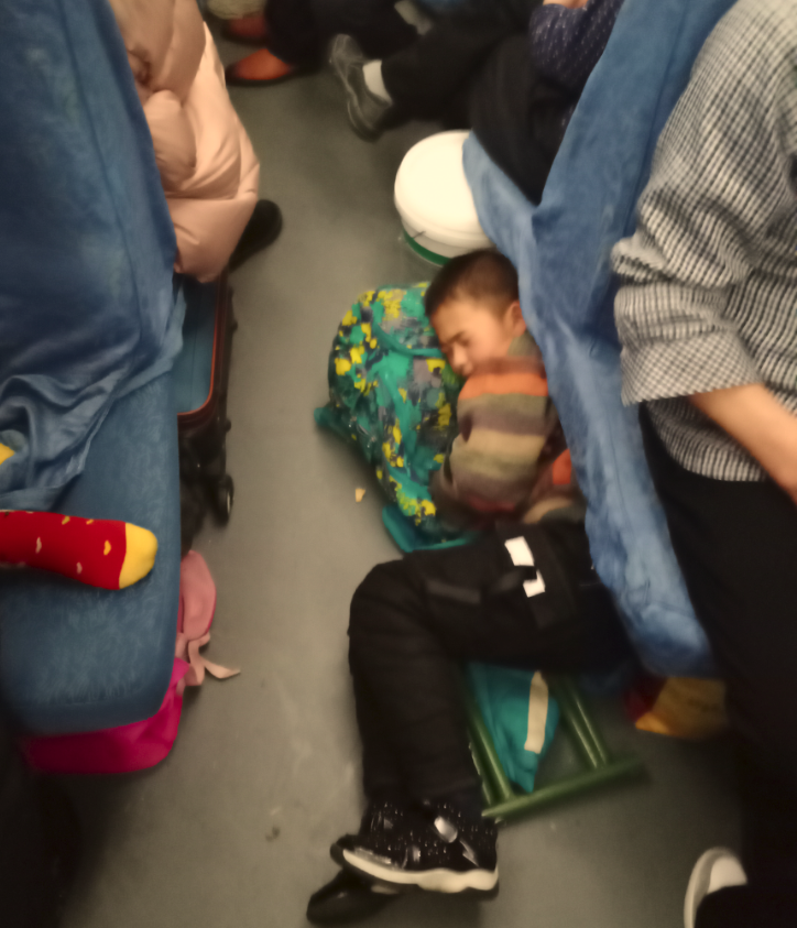 夫妻二人不坐座位,把座位让给女儿躺着,妻子坐在座位前的地板上,木工师傅和我挤一块,屁股下坐一个盛涂料的桶。