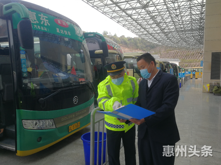 在惠州汽车客运站,工作人员手持测温仪为旅客测量体温,发放防疫宣传资料,做好实名登记,提醒旅客戴好口罩,并定期对车站、车辆进行消毒。