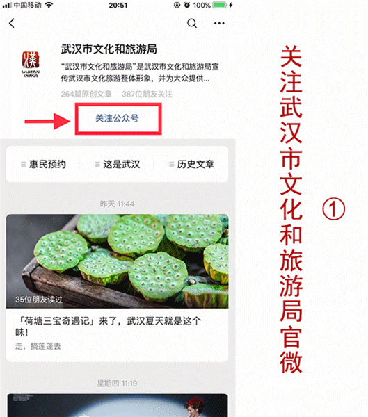预约方式:关注武汉市文化和旅游局官方微信(wuhanwenlv),点击左下角菜单“惠民预约”预约。