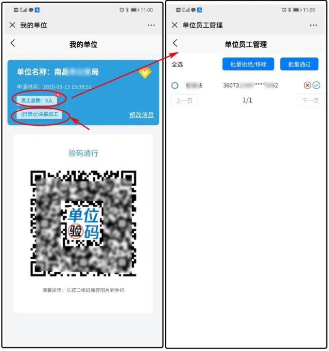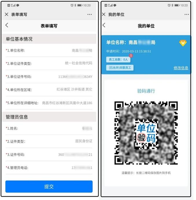 1、单位管理员如实填写单位信息和本单位码管理员信息,提交后将生成本单位专属的“单位码”。截屏、或长按二维码保存图片至手机,打印“单位码”张贴至单位门口。