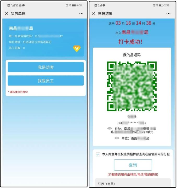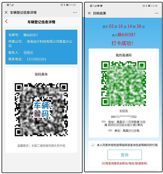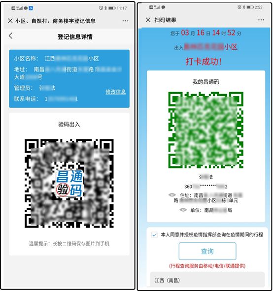 人员出入小区、自然村、商务楼宇,扫描专属验码通行的“昌通码”,显示打卡成功,出示给司乘工作人员查验。
