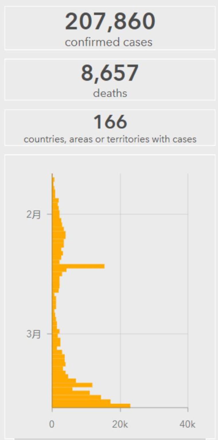 据世卫组织截至欧洲中部时间18日下午18时(北京时间19日凌晨1时)的实时统计数据显示,全球确诊病例逾20万例,累计死亡病例达8657例。其中,中国以外病例已经超过12万。
