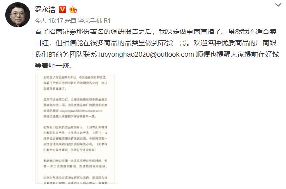今天,罗永浩在微博宣布:看了招商证券那份著名的调研报告之后,决定做电商直播了。他表示,“虽然我不适合卖口红,但相信能在很多商品的品类里做到带货一哥。”