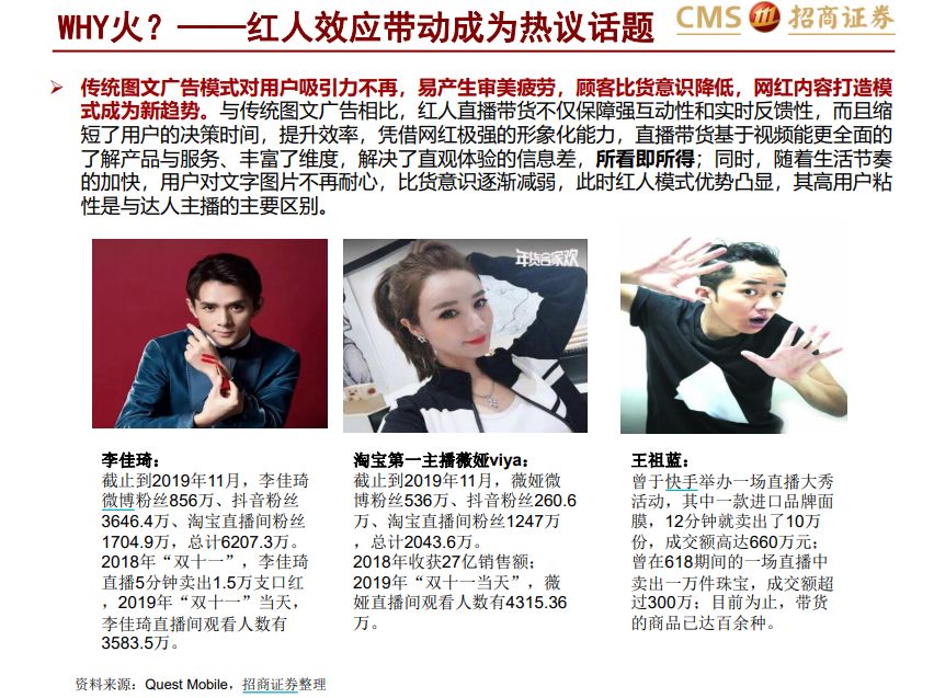 传统图文广告模式对用户吸引力不再,易产生审美疲劳,顾客比货意识降低,网红内容打造模 式成为新趋势。与传统图文广告相比,红人直播带货不仅保障强互动性和实时反馈性,而且缩短了用户的决策时间,提升效率,凭借网红极强的形象化能力,直播带货基于视频能更全面的了解产品与服务、丰富了维度,解决了直观体验的信息差,所看即所得;同时,随着生活节奏的加快,用户对文字图片不再耐心,比货意识逐渐减弱,此时红人模式优势凸显,其高用户粘性是与达人主播的主要区别。