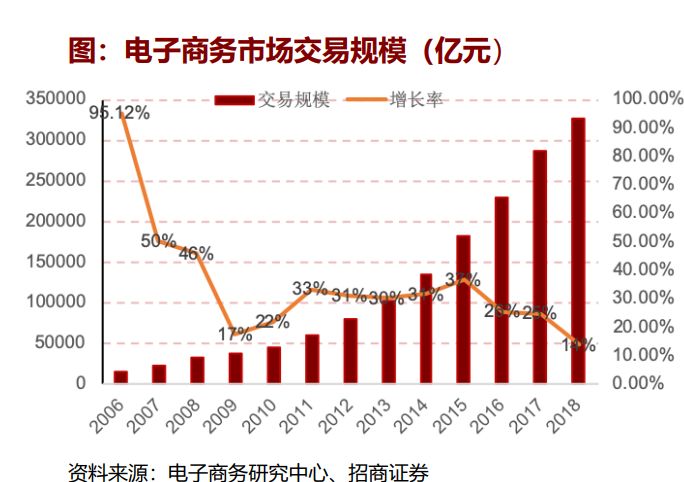 电子商务市场交易规模持续扩大,环比增速持续放缓,电商市场竞争日益激烈。从2006年至 2018年,中国的电子商务市场交易规模从14400亿元增长至325500亿元;电子商务规模迅速 扩大。电商市场交易规模的环比增速在2011年至2015年间,维持在33%左右;从2016年至 2018年,其交易规模的环比增速从36.57%持续下降至13.57%。行业竞争日益激烈。