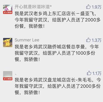 与此同时,在其他被按下暂停键的城市,老乡鸡还有很多的同事坚守在岗位上,为大家提供一顿好饭,保障民生需求。束从轩表示,很多都是95后的孩子,你们为抗击疫情做出了很大的贡献。都是老乡鸡的宝藏男孩、宝藏女孩!