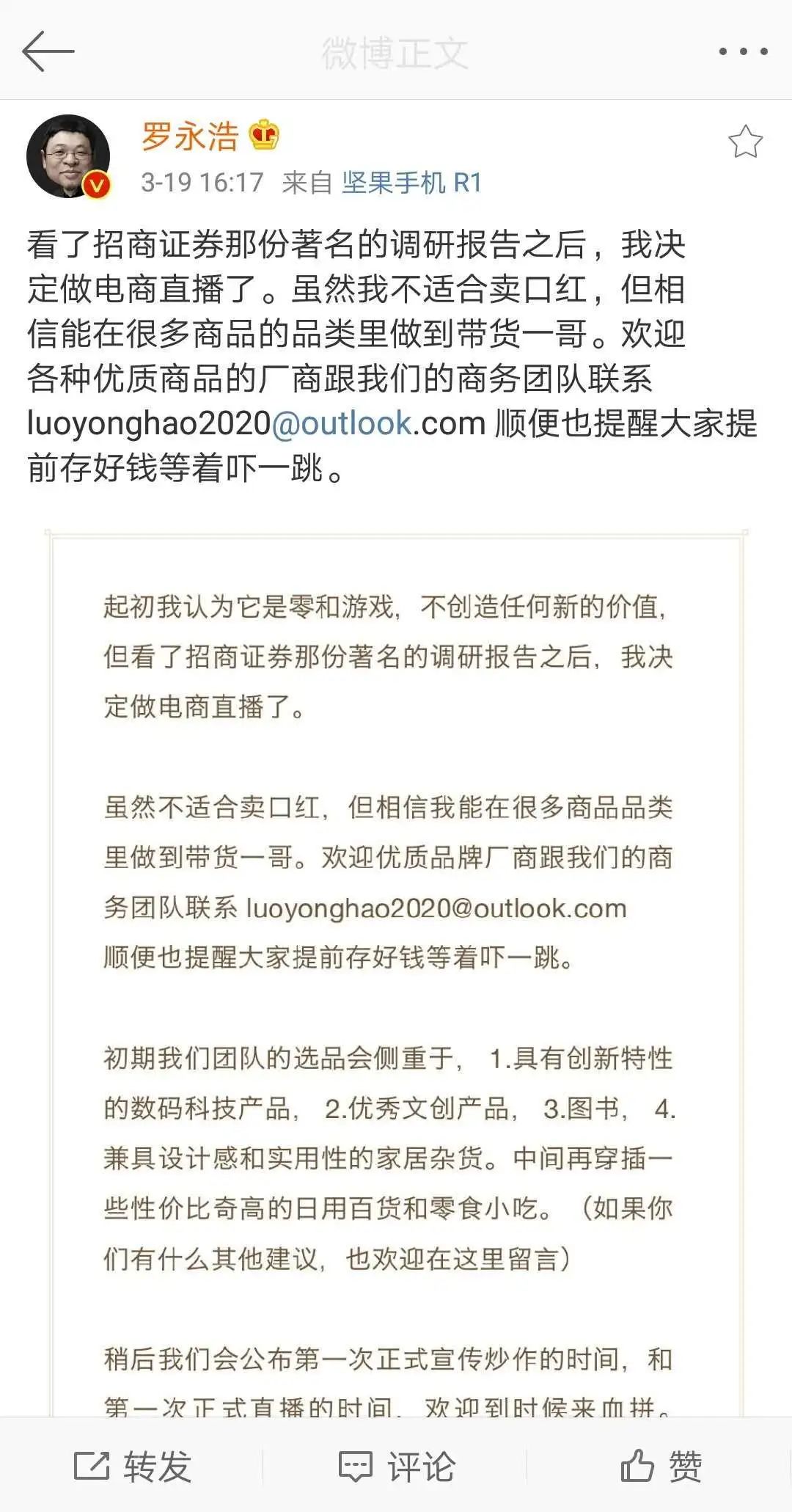 对于老罗进军直播行业这件事,作为资深罗粉的我感到很激动,因为终于可以白嫖老罗的相声了,不,可以支持老罗的事业了。