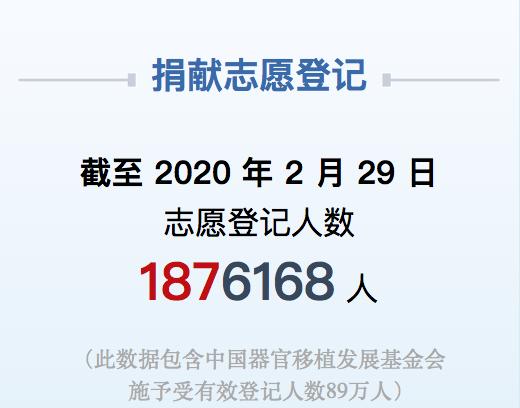 根据“中国人体器官捐献管理中心”数据显示,截至2020年2月29日,中国器官捐献(含遗体捐献)志愿登记人数为1876168人。