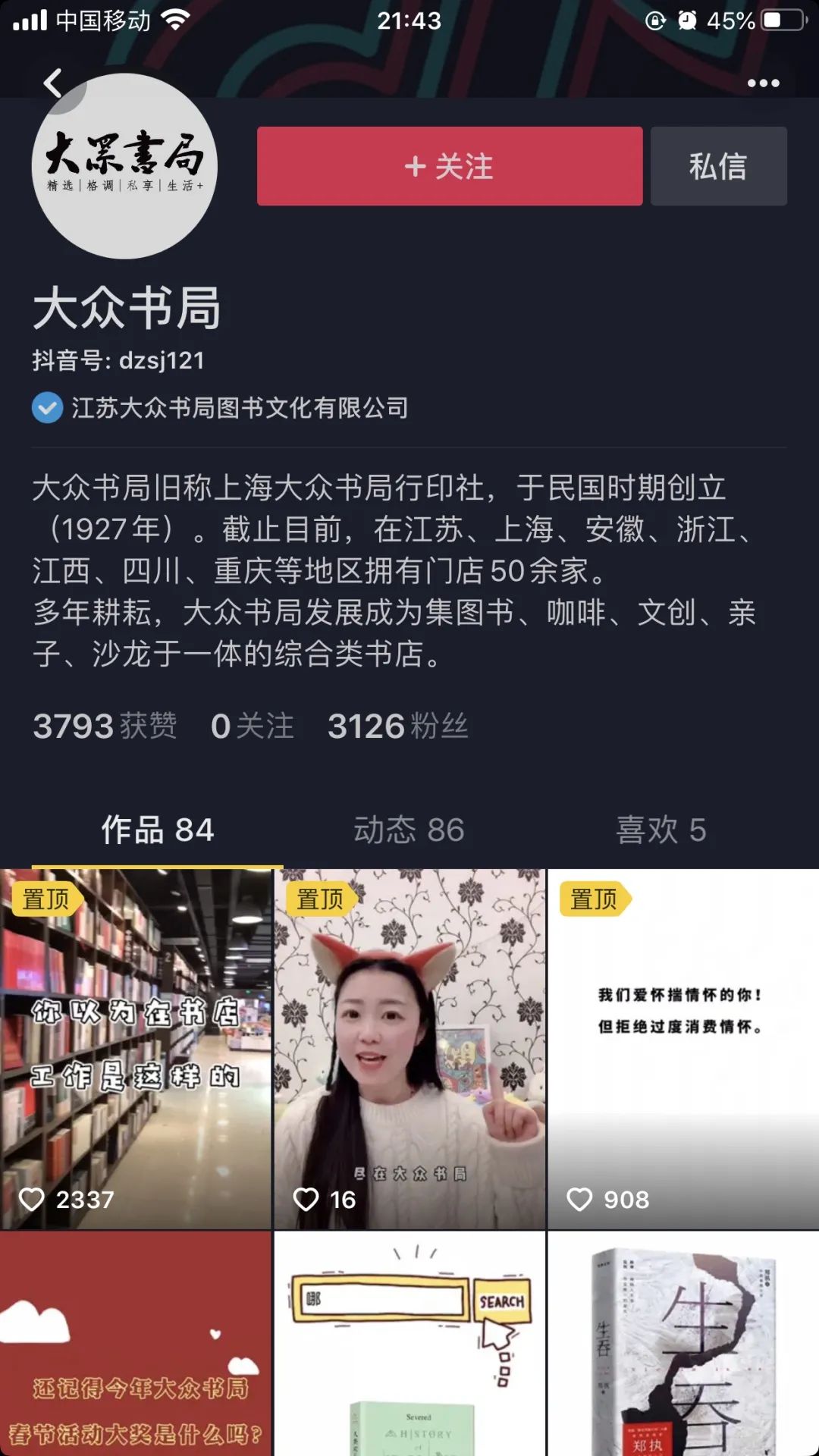大众书局从2月开设抖音号后,在一个多月里发布了84个视频,尝试了从荐书、逛店到疫情新闻转发、直播预告多个主题的内容,从题材、语言风格的不断调整中,你能感受到他们努力探索的意味。
