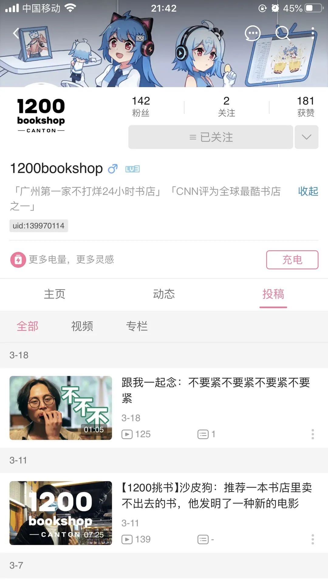 目前1200在抖音更新了两个视频,一个是书店的全景展示,一个是手冲咖啡制作。在B站账号中陆续更新了11个视频,以店员荐书为主,在店内漫步、对着镜头聊天,视频长度在3到10分钟之间,在内容容量更大的平台上,书店似乎找到了更为舒适的节奏。