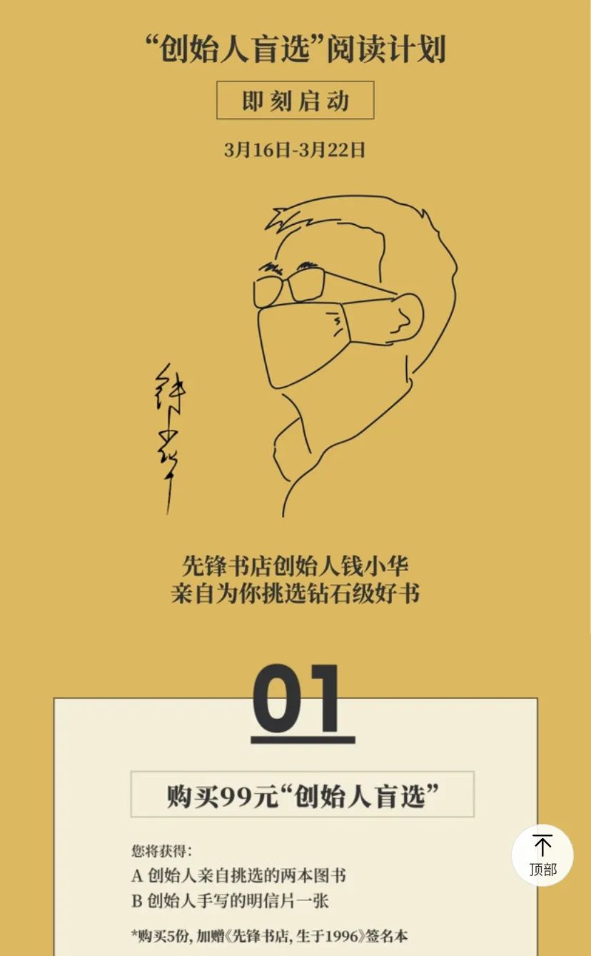 先锋书店早在两三年前就开始尝试盲选售卖。这次疫情期间,先锋提出“盲选——是书本的奇遇,阅读冒险” ,推出了多种盲选礼包,以书籍类型、节日等作主题区分,同时推出了“创始人盲袋”,由钱小华亲手选书。每份盲袋视乎价格赠送手写明信片与帆布包等文创礼品。