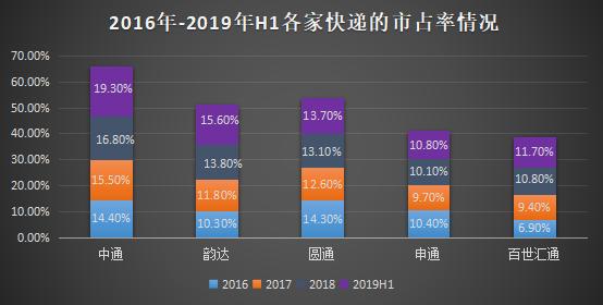 在此之前,中通已经于2016年至2018年实现了“三连冠”,稳坐头把交椅,2019年市场份额较上年上升2.3个百分点,2019年的年度行业冠军仍然是中通。