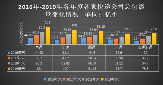 市场份额的变化也体现在一个重要的指标上面,即用户的包裹量上,查询中通与其他各快递公司历年的包裹量,也可以看出其综合实力。