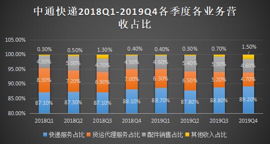 根据财报披露的相关数据来看,2018年Q1-2019年Q4中通快递的包裹量基本保持了平稳较快增长。2019年Q1-Q4各季度的同比增速分别为41.6%、46.8%、45.9%、36.1%,均高于2018年Q1-Q4的36%、41.7%、36.5%、34.7%的同比增速,增长速度稳中有升。