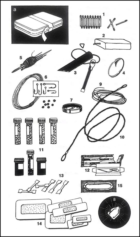 1.火柴 2.蜡烛 3.打火石 4.放大镜 5.针线 6.鱼钩和鱼线 7.指南针 8.β灯 9.圈套绳索 10.弹性锯条 11.小药瓶(止痛剂、他抗生素、抗疟疾药物等)12.外科手术刀片 13.防水膏药贴 14.避孕套