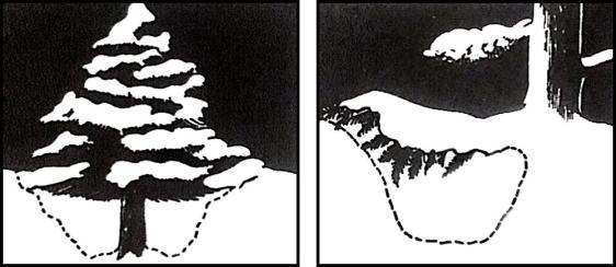 在高纬度的森林,一些大树的四周可能有被大雪掩埋的雪洞,可当作临时住所。