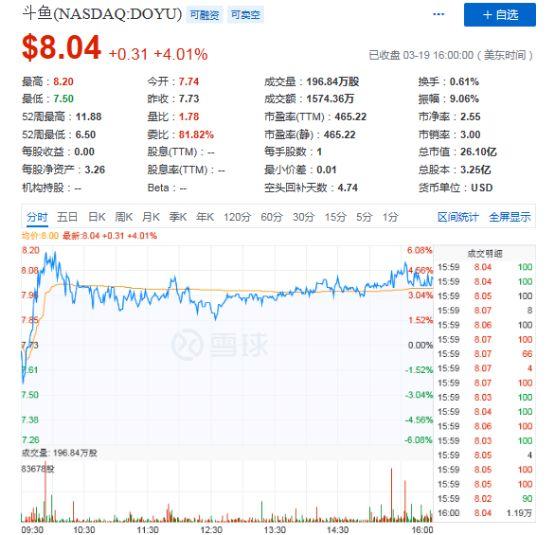 受财报成绩的刺激,在美股大盘持续下跌的情况下,斗鱼股价实现逆势上涨。周四盘前,斗鱼股价便暴涨5.3%,当日以4.01%的涨幅收盘,报8.04美元。