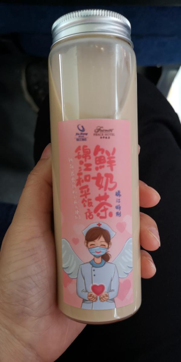 下午4点半左右,医疗队统一乘坐大巴前往集中隔离点,一上大巴车,医疗队员就收到了热乎乎的奶茶。
