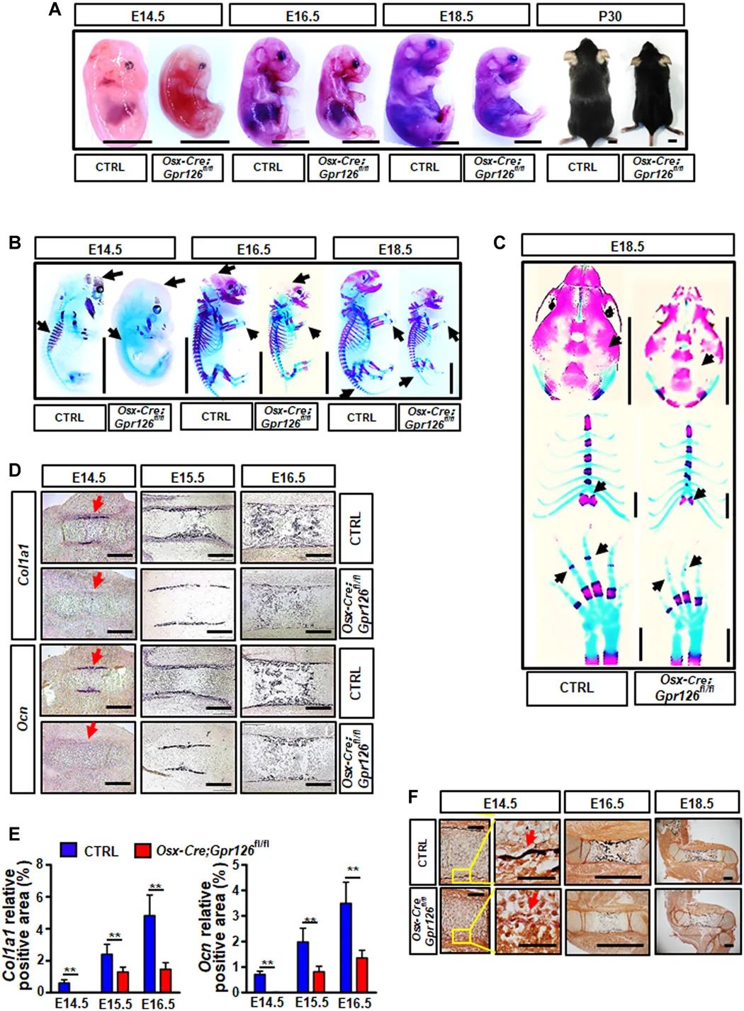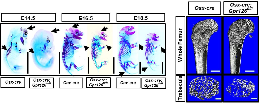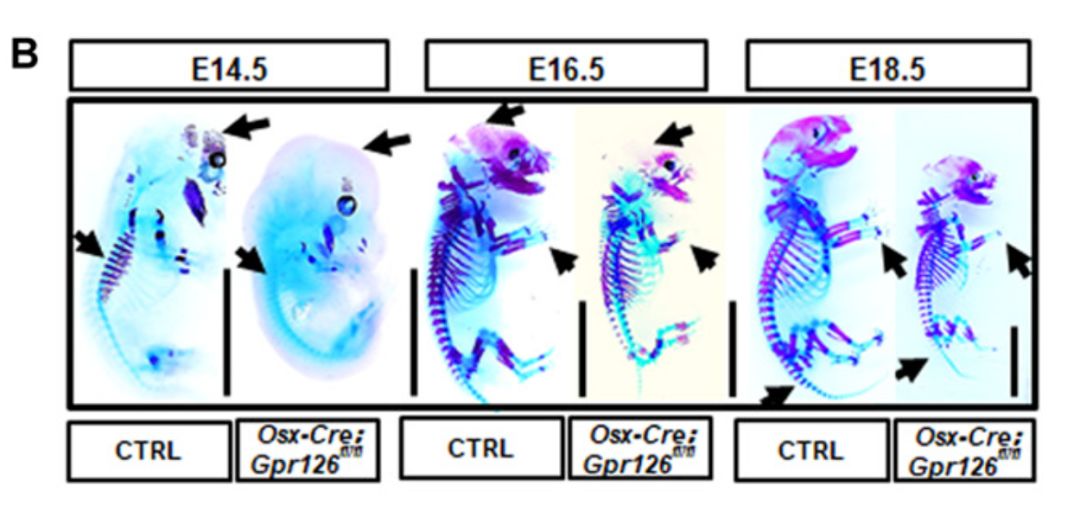 该研究团队采用人类身材矮小的全基因组关联分析(GWAS)的相关结果,并利用不同骨细胞特异性Gpr126基因敲除小鼠模型进行研究,发现仅在成骨细胞特异性敲除Gpr126的小鼠在胚胎发育和出生后的体长显著变短,而破骨细胞和软骨细胞特异性敲除的小鼠中未发现体长变化。