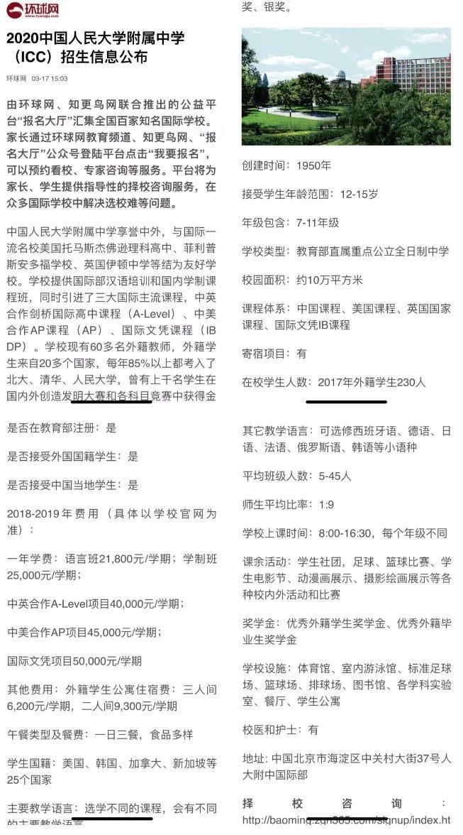 网上流传信息对人大附中ICC的国际课程、师资、在校学生人数、费用等作出介绍。并在文首附上预约报名方式。文章称,家长登录平台点击“我要报名”可以预约看校,专家咨询等服务。记者注意到,截至发稿相关文章链接已失效。