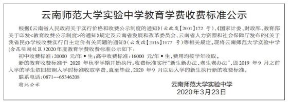 <教育收费公示制度>的通知》规定及云南省发展和改革委员会、云南省人力资源和社会保障厅发布的《关于我省民办学校收费实行自主定价有关问题的通知》(云发改【2016】1077 号)等相关规定。现将云南师范大学实验中学(含昆明湖校区)2020 年度教育学费收费标准公示如下:教育收费公示制度>初中收费标准:20000 元/年•生;高中收费标准:16000 元/年•生,费用均按学年收取。