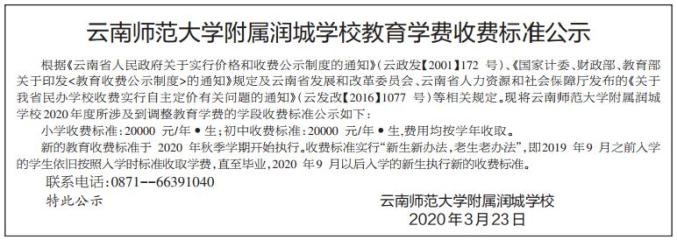 3月23日,云南师范大学实验中学和云南师范大学附属润城学校在媒体上公示了学费收费标准。