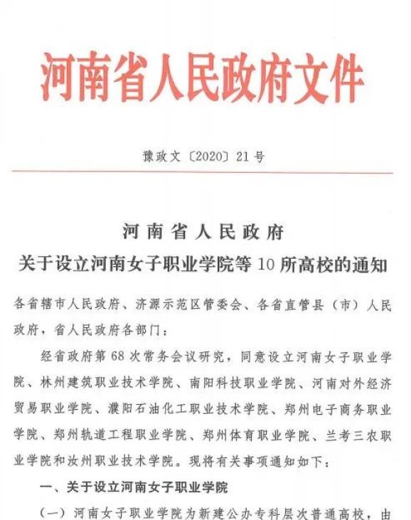 2020年3月13日,河南省人民政府下发了《关于设立河南女子职业学院等10所高校的通知》(豫政〔2020〕21号),明确了设立河南女子职业学院的有关事项。