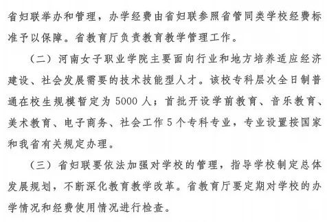 (一)河南女子职业学院为新建公办专科层次普通高校,由省妇联举办和管理,办学经费由省妇联参照省管同类学校经费标准予以保障。省教育厅负责教育教学管理工作。