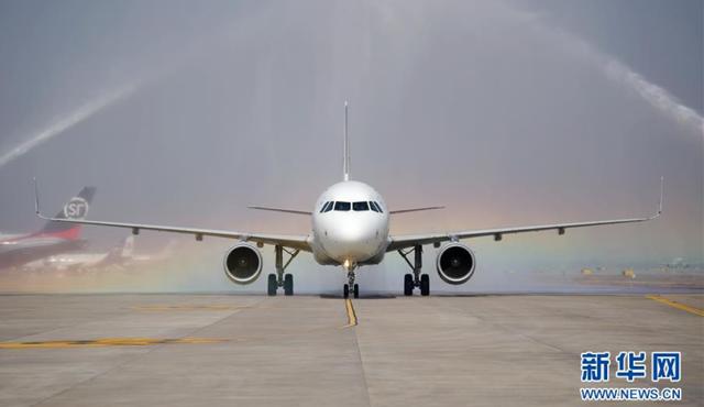 陕西省第一批援鄂医疗队乘坐的飞机抵达西安咸阳国际机场时受到“水门礼”迎接
