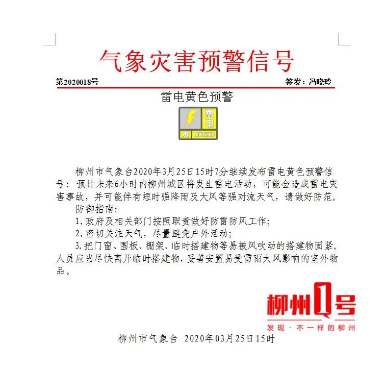 柳州市气象台2020年3月25日15时07分发布雷电黄色预警信号:预计未来6小时内柳州城区将发生雷电活动,可能会造成雷电灾害事故,并可能伴有强降雨、大风等强对流天气,请做好防范。