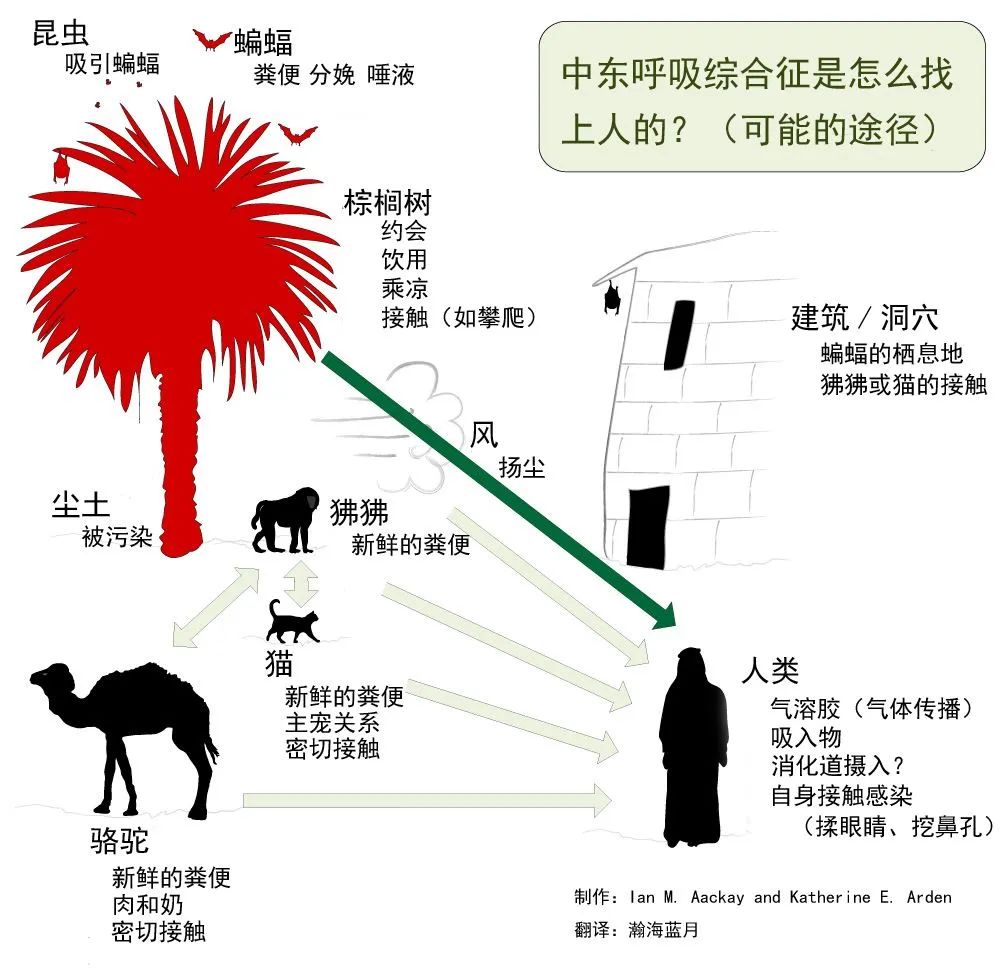 有人可能会问,蝙蝠源病毒是否会直接感染人类呢?这是有可能的,但可能性极低。一是因为病毒入侵人体是一个特异性的过程,它需要有相应的受体才能让细胞开启方便的大门,并非所有蝙蝠都会携带对人类易感的病毒;二是因为蝙蝠通常喜欢幽居在洞穴、树缝等地方,这种“夜游侠”接触到人类的几率很小。但是很多野生动物的栖息环境和蝙蝠的有所重叠,如果动物被吸血蝙蝠叮咬,或是接触了蝙蝠的排泄物,则都可能被感染。我们已经知道,许多蝙蝠源病毒都是以某种动物为中间媒介进而传染给人类的,这些动物又被称为中间宿主,譬如SARS通过果子狸传染给人类,MERS通过骆驼传染给人类,埃博拉病毒通过大猩猩和黑猩猩传染给人类,尼帕病毒(Nipah)通过猪传染给人类,亨德拉病毒通过马传染给人类,马尔堡病毒通过非洲绿猴传染给人类……尽管多了一道中间程序,这些病毒在最终入侵人体之时仍然具有极高的毒性和致命性[2]。