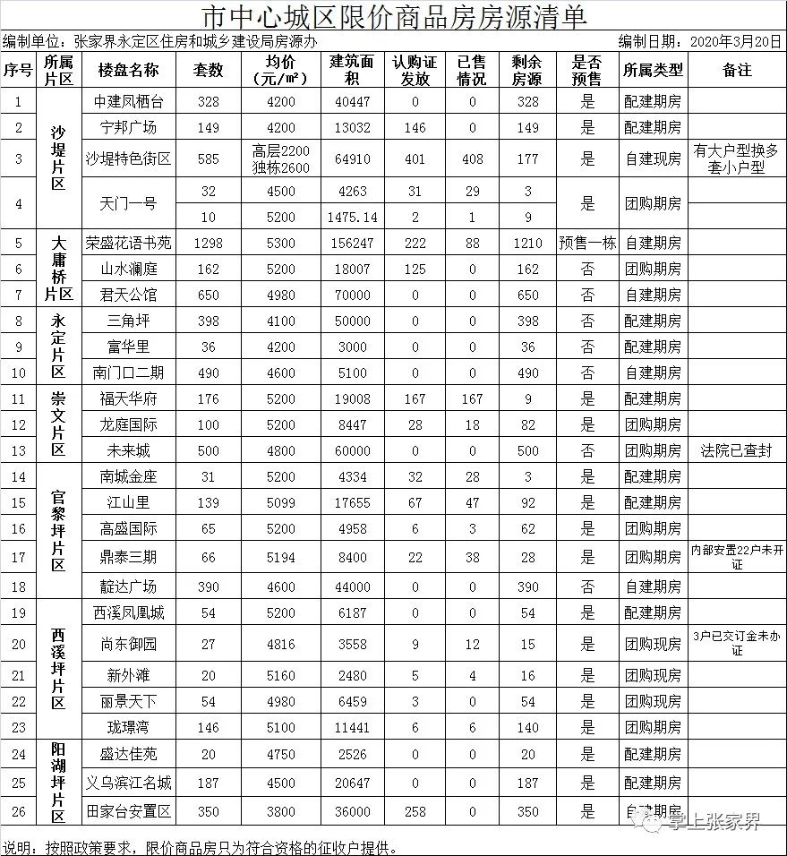 3月20日,永定区住房和城乡建设局发出公示,向全市人民公布了市城区限价商品房房源清单,共涉及市城区沙堤片区、大庸桥片区、永定片区、崇文片区、官黎坪片区、西溪坪片区、阳湖坪片区7大片区26个楼盘6463套房。公示时间为3月20日至3月27日。