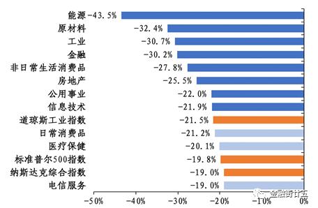 能源、原材料和工业等7个非金融一级行业的跌幅超过美国三大股指的跌幅,其中能源板块下跌幅度高达43.5%,为表现最差的行业。对这些行业的部分细分板块进行分析,梳理出跌幅较大的15个子板块,如图3所示。这些子行业的下跌的原因可以分为三大类: