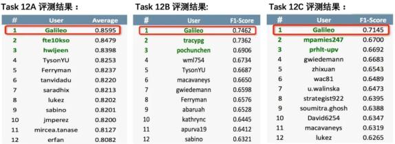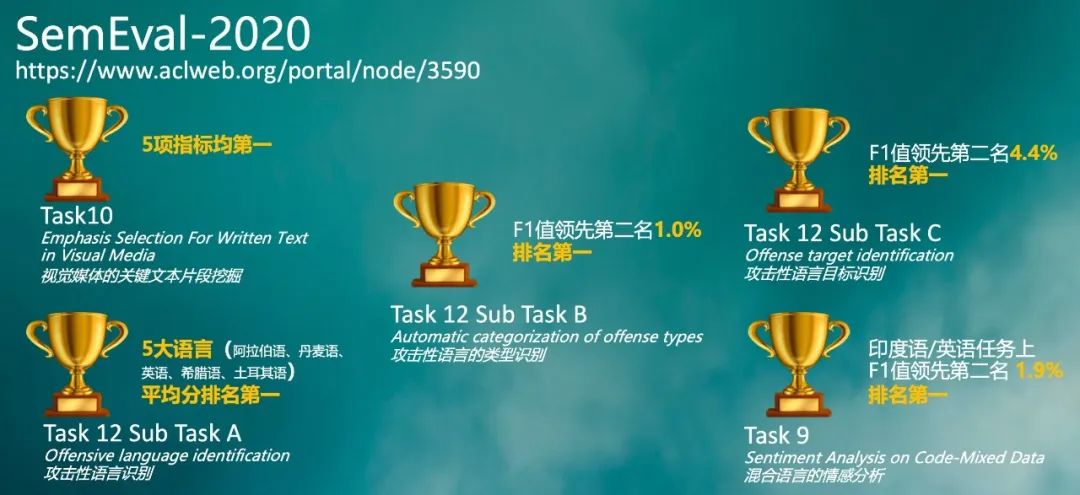 另外两个任务是在英语环境中对攻击性语言的类型和目标分别进行更加精细化的分析。百度 ERNIE 团队通过数据蒸馏的技术,从更多无监督的网络文本中学习多种模型的 Soft Label,分别以 F1 超过第二名 1.0% 和 4.4% 的绝对优势取得了冠军。