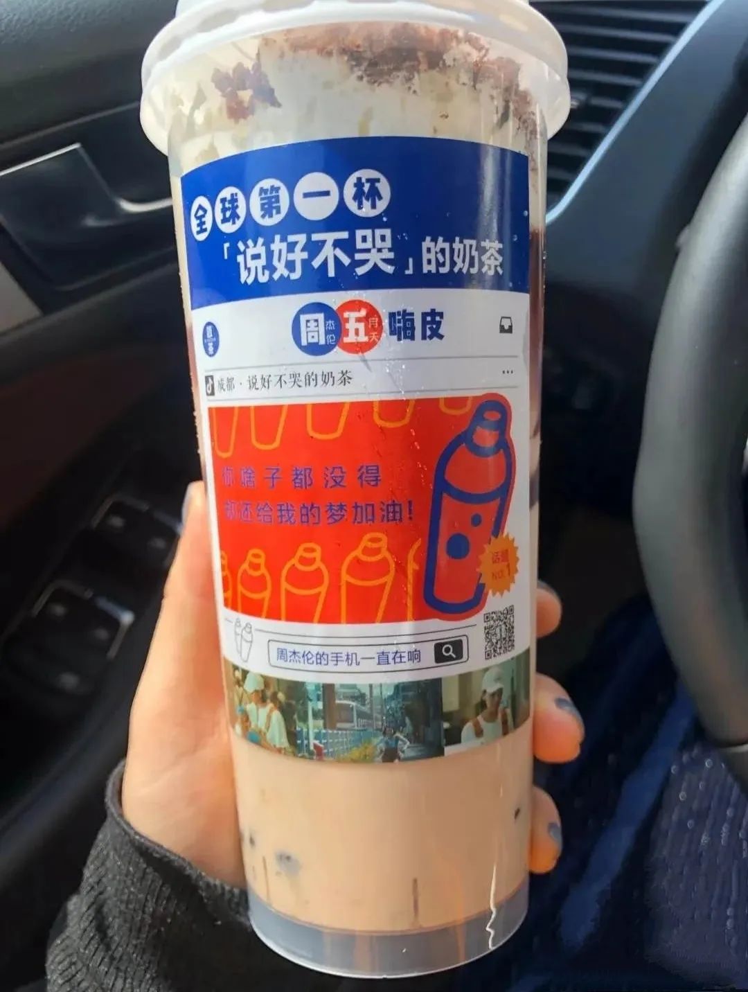 爱喝奶茶的杰伦刚出单曲,他就推出了“全球第一杯说好不哭”的奶茶。