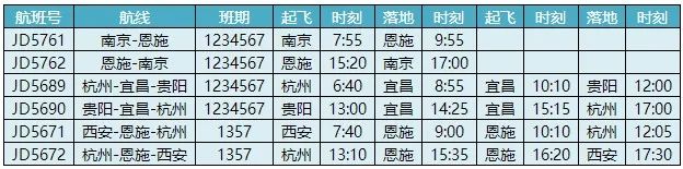 首日复航的航线包括杭州=恩施=西安、南京=恩施、杭州=宜昌=贵阳。其中南京=恩施、杭州=宜昌=贵阳两条航线班期为一周七天不间断,杭州=恩施=西安班期为每周一、三、五、日。具体航班信息如下: