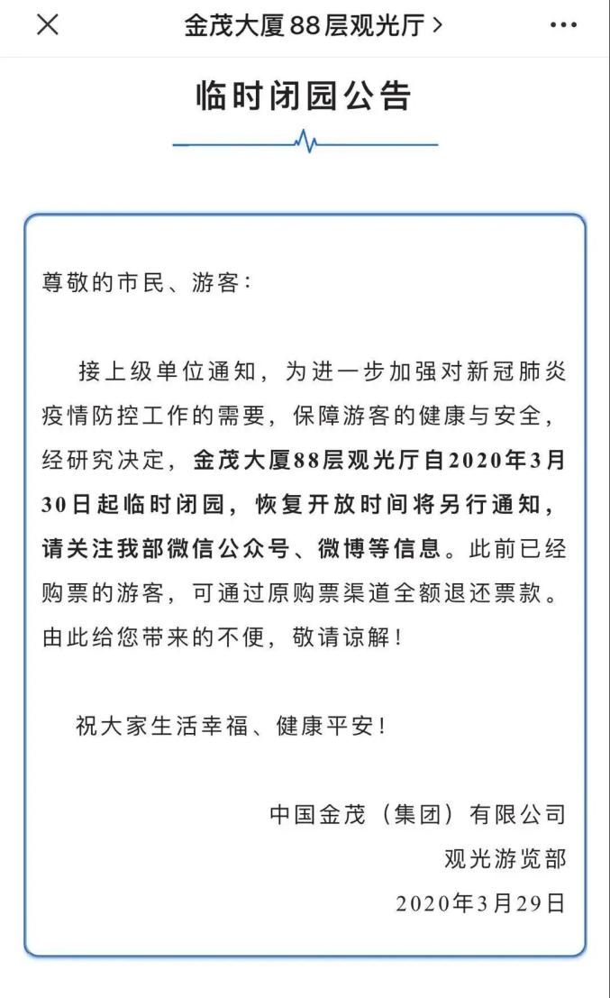 记者3月29日获悉,为进一步加强对新冠肺炎疫情防控工作的需要,保障游客的健康与安全,上海市东方明珠、金茂大厦、上海中心三大高楼观光厅自3月30日起临时闭园,恢复开放时间将另行通知。此前已经购票的游客,可通过原购票渠道全额退还票款。