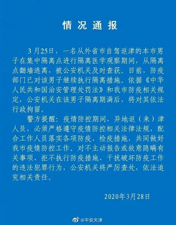 据天津市公安局官方微博@平安天津 3月28日通报,3月25日,一名从外省市自驾返津的男子在集中隔离点进行隔离医学观察期间,从隔离点翻墙逃离,被公安机关及时查获。目前,防疫部门已对该男子继续执行隔离措施。依据《中华人民共和国治安管理处罚法》和天津市防疫相关规定,公安机关在该男子隔离期满后,将对其依法行政拘留。