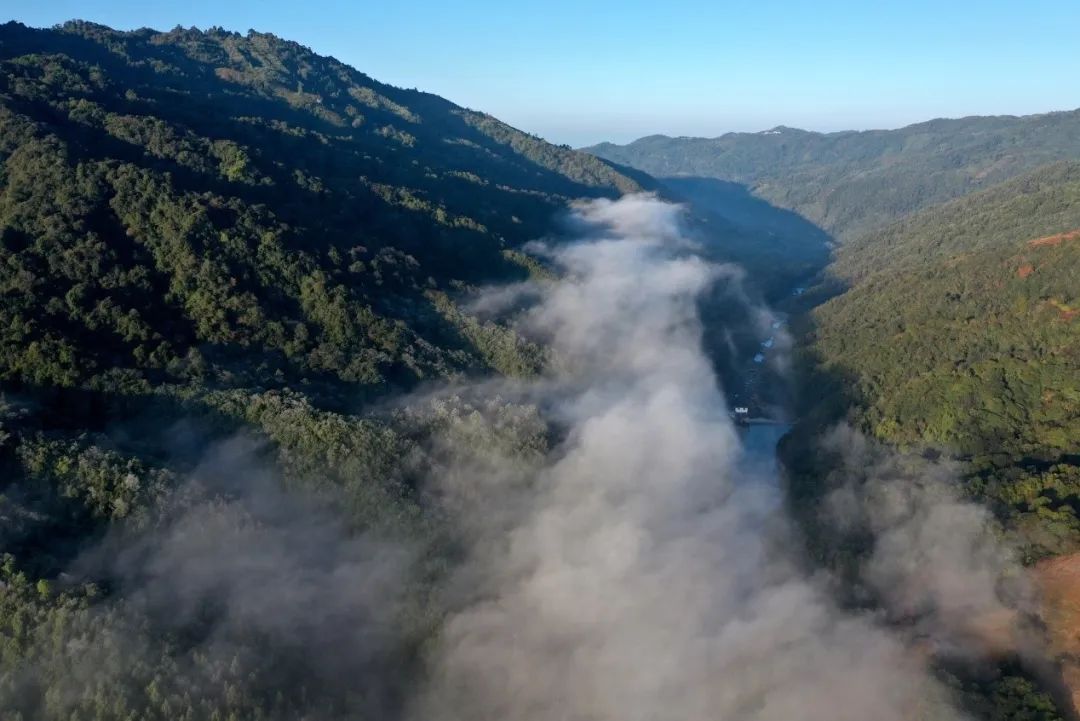 在盈江县,长臂猿栖息地离村寨近。早上,我们离开家,爬到后山半山腰时,太阳升起来。往下看是一条河,云雾还没散。两岸的长臂猿陆续开始鸣叫。