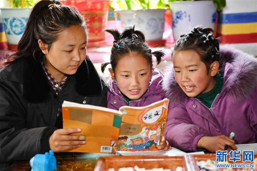 在林芝市西日卡村,大学生曲珍(左)辅导小学生次仁拉姆(中)和扎西卓玛朗诵课文(3月20日摄)。新华社记者 张汝锋 摄