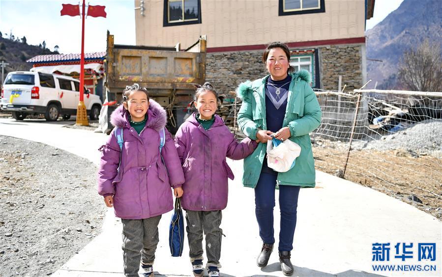 在林芝市西日卡村,刚刚在邻居家做完功课的小学生次仁拉姆(中)、扎西卓玛和妈妈一起回家(3月20日摄)。新华社记者 张汝锋 摄