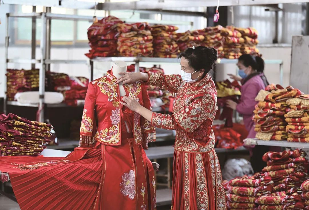 ■28日,在峄城区峨山镇左庄村扶贫车间,工人在包装新郎新娘服装。峨山镇投资300余万元建设左庄扶贫车间,专业生产新郎新娘服装,产品款式达100余种,每月可以生产服装3000套左右,通过实体加电商渠道模式销往全国各地,安置附近村庄30多人在家门口就业。(新华社记者 范长国 摄)