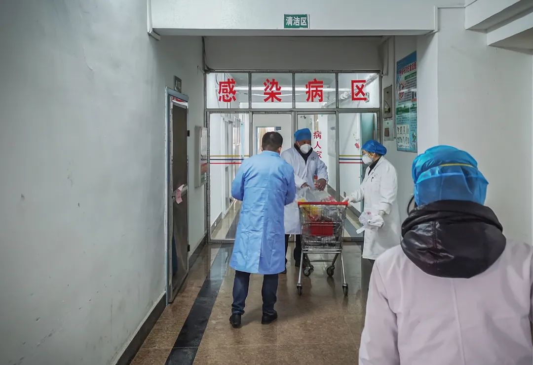 2020年2月1日,医院后勤保障人员正在给住院病人送煎好的中药。病人是封闭管理,不仅治疗工作由医务人员承担,连一日三餐和生活用品都由医院提供。
